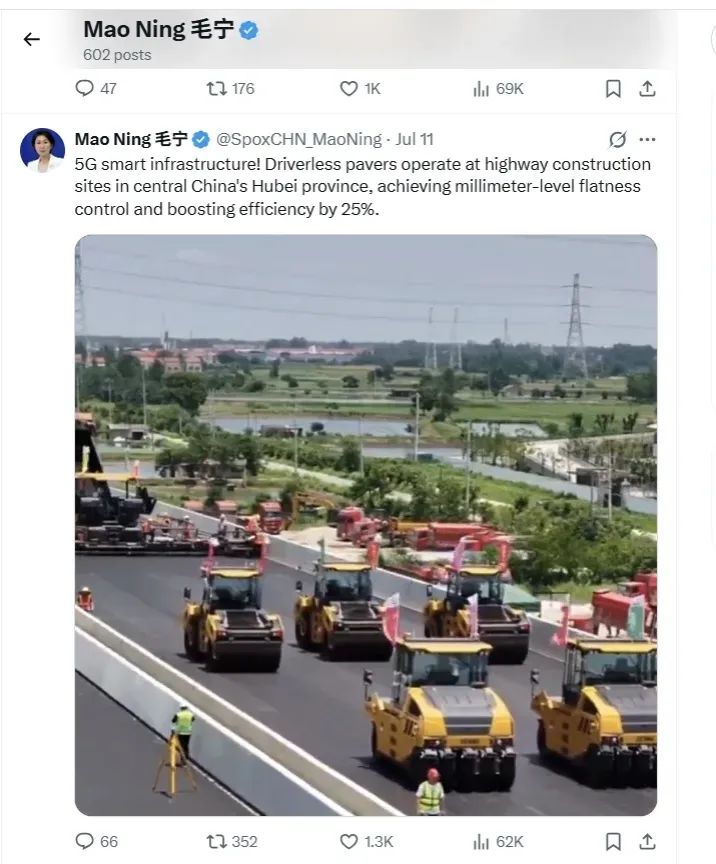 近日,中國(guó)外交部新聞司司長(zhǎng)、發(fā)言人毛寧關(guān)注到雙柳長(zhǎng)江大橋的路面施工項(xiàng)目,海外社交媒體平臺(tái),發(fā)表該項(xiàng)目的徐工無(wú)人駕駛作業(yè)成果,將其作為中國(guó)高質(zhì)量發(fā)展和科技進(jìn)步的生動(dòng)例證向世界推介。
