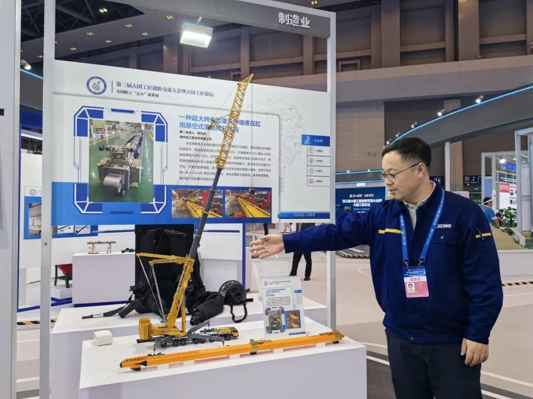 以匠心致創(chuàng)新,徐工人在攻克核心難題上從不缺席。徐工液壓事業(yè)部陳向兵完成的“一種超大噸位起重機(jī)伸縮液壓缸用懸空式滑道爬升結(jié)構(gòu)”亮相全國總工會“五小”成果展區(qū)。