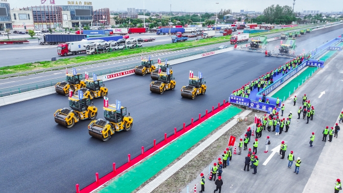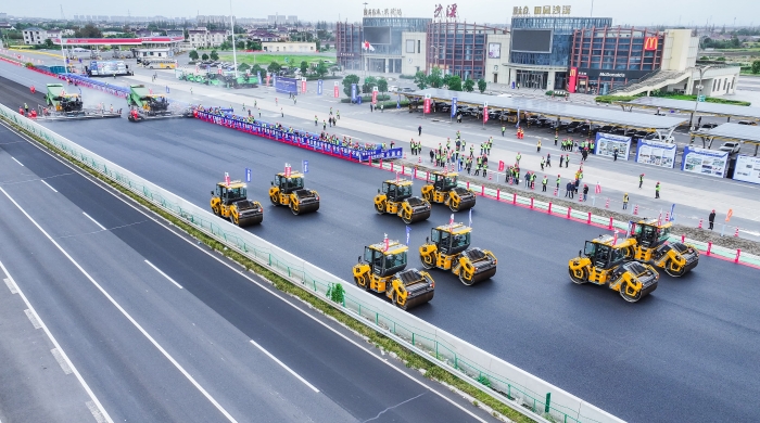 滬武高速施工現(xiàn)場(chǎng),2臺(tái)攤鋪機(jī)+12臺(tái)壓路機(jī)組成“全球最大規(guī)模智慧施工集群”。