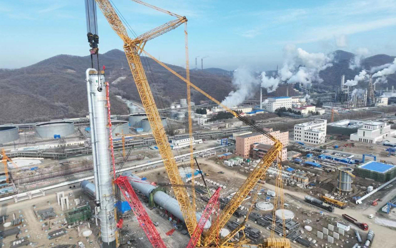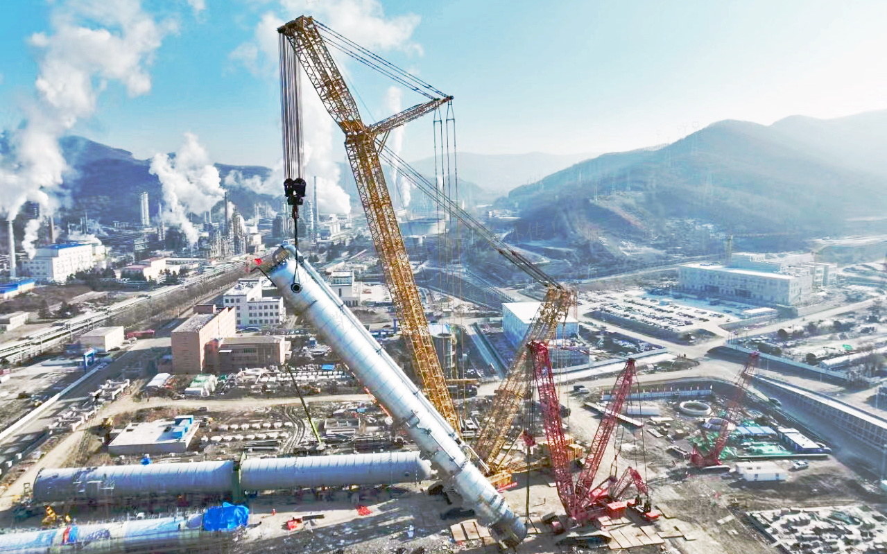 施工時(shí)刻,伴隨吊裝指令聲下達(dá),XGC88000搭配超起102+27m固定副臂,在1250噸吊車(chē)默契溜尾配合下,順利擎起千噸乙烯塔,并平穩(wěn)完成吊裝全過(guò)程,再度展現(xiàn)屬于吊裝施工的獨(dú)有魅力。