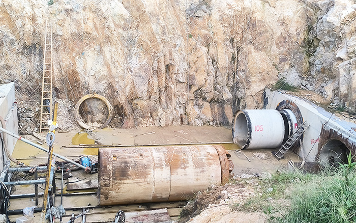 徐工XDN1800-R 巖石頂管機(jī)橫穿202省道、打進(jìn)山體,頂進(jìn)地層全段為硬巖(花崗巖)以及少數(shù)的弱風(fēng)化巖石地層,巖石硬度在120~140MPa 左右,單段頂進(jìn) 210 米,頂進(jìn)直徑1.8米、長(zhǎng)2米的水泥管,最終用時(shí)58天,順利出洞。