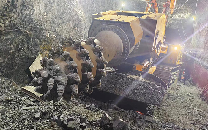 該礦施工斷面5m*4.5m,巖層硬度在60MPa左右,客戶所選購的徐工XTR7/360掘進(jìn)機(jī)最大截割高度7.2m,可實(shí)現(xiàn)中等斷面隧道一次開挖成型,切割頭配合硬巖截齒,掘進(jìn)時(shí)可以向巖壁施加每平方厘米1.5噸的力量,在機(jī)動(dòng)靈活的基礎(chǔ)上兼具掘進(jìn)硬巖的優(yōu)勢(shì)。