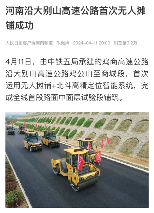 此次試驗段是沿大別山高速公路雞公山至商城段JSSG-2標,首次運用無人攤鋪+北斗高精定位智能系統(tǒng),完成全線首段路面中面層試驗段鋪筑。