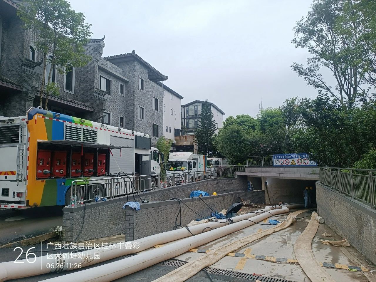 除桂林站地下停車場(chǎng)之外,徐工排澇產(chǎn)品還參與了桂林丹桂府小區(qū)以及大河圩旁的地下車庫(kù)內(nèi)澇救援任務(wù)。