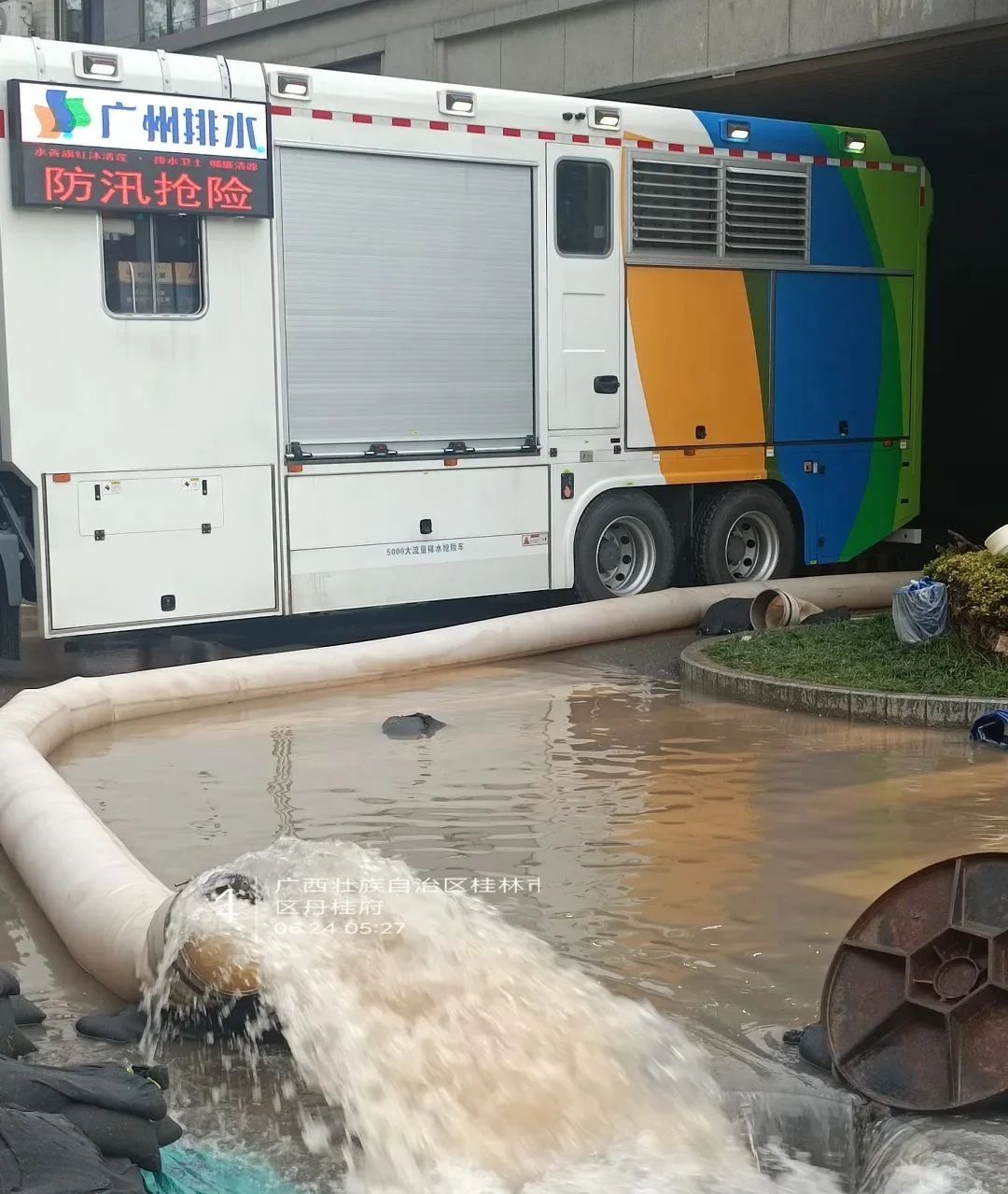 位于桂林七星區(qū)的丹桂府小區(qū),地下車庫(kù)占地面積超50000m3,高度約3.5m,也同樣遭受到洪水的侵襲。來(lái)自廣州排水的徐工PS50B泵組式大流量排水搶險(xiǎn)車迅速趕來(lái),進(jìn)行定點(diǎn)強(qiáng)排作業(yè)。十余小時(shí)加大馬力連續(xù)抽排積水。順利完成任務(wù)后,該臺(tái)設(shè)備又迅速趕往下一救援場(chǎng)地。