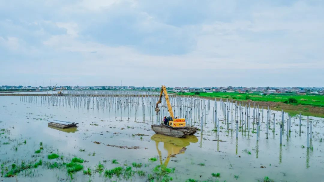 在漁業(yè)較為發(fā)達(dá)的濱海港鎮(zhèn),“漁光互補(bǔ)”光伏發(fā)電項(xiàng)目建設(shè)正如火如荼,項(xiàng)目現(xiàn)場,徐工水上打樁機(jī)的身影隨處可見。