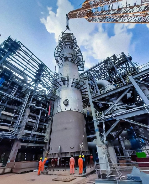 吊裝過程中,徐工XLC30000履帶起重機(jī)采用108m超起主臂單雙臂增強(qiáng)工況,將重達(dá)650t的項(xiàng)目首臺(tái)氫化反應(yīng)器緩緩起吊豎立,并提升至40m高處,隨后完成吊載回轉(zhuǎn),精準(zhǔn)落置在指定安裝位置。