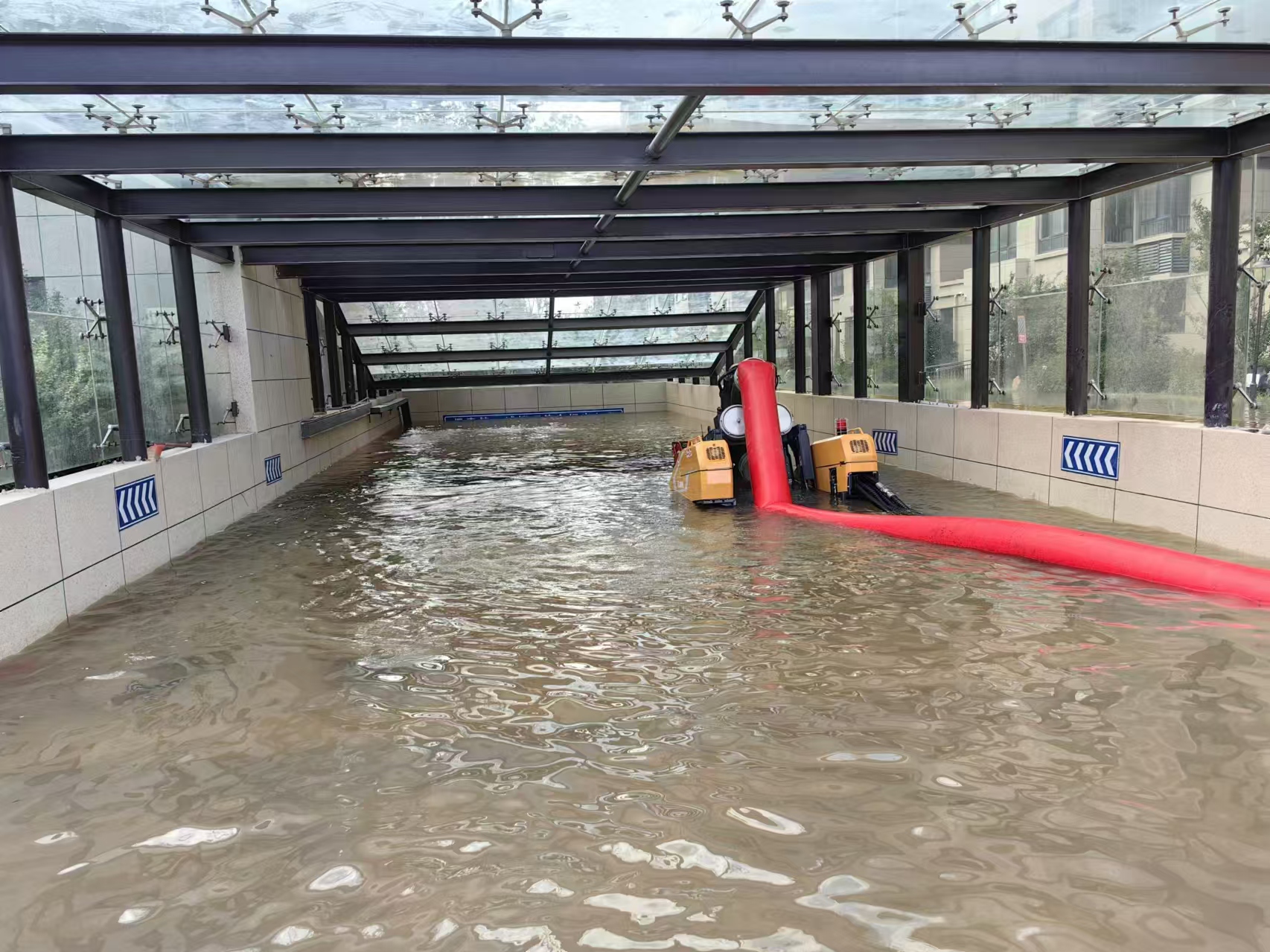 閩泰小區(qū)位于蕭縣龍河街道交通東路,暴雨導(dǎo)致小區(qū)變身“水簾洞”,路面積水已沒人員小腿,迎街地下車庫積水倒灌,出入口已被完全淹沒,近百臺車輛無法轉(zhuǎn)移,受損嚴(yán)重。由于車庫平均寬度僅2.5m,大型救援車輛進(jìn)出受阻,緊急之際,徐工調(diào)派PS50F子母式排澇車趕往支援。