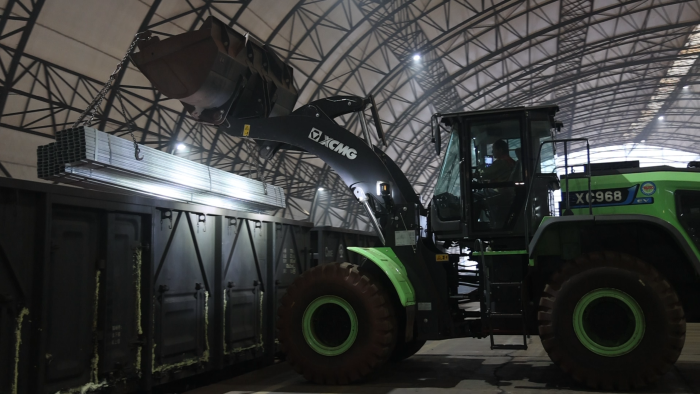貨運站臺上,一臺綠甲戰(zhàn)士格外引人注目,這臺徐工XC968-EV純電動裝載機不同以往的圓弧型大臂像極了武俠小說中的“圓月彎刀”,格外引人注目。