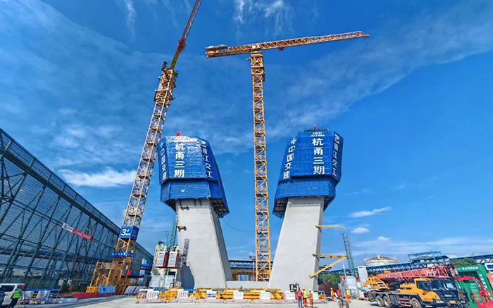 在杭甬復線寧波三期甬江特大橋施工現(xiàn)場,1臺徐工XGT3000-120S、2臺XGT3000-100S如鋼鐵巨人伸展手臂,正加緊進行著鋼筋部品的吊裝,助力3座大橋主塔以平均每天1米的速度向云端挺進,贏得施工方“技術先進、安全可靠、吊裝能力強、操作平穩(wěn)、智能化水平高、施工效益顯著”的高度肯定。