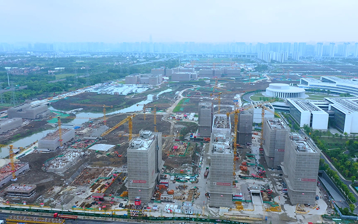 西湖大學(xué)云谷校區(qū)正一片火熱,高聳的徐工群塔正揮舞長臂、緊張施工,與遠處的青山綠水交相輝映,盡情展現(xiàn)力與美的結(jié)合。