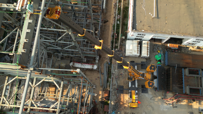 由于場地狹窄,障礙物環(huán)繞,集氣包還需精準送入已建車間內(nèi)部,車間上方同樣阻礙重重,給施工增加了難度。