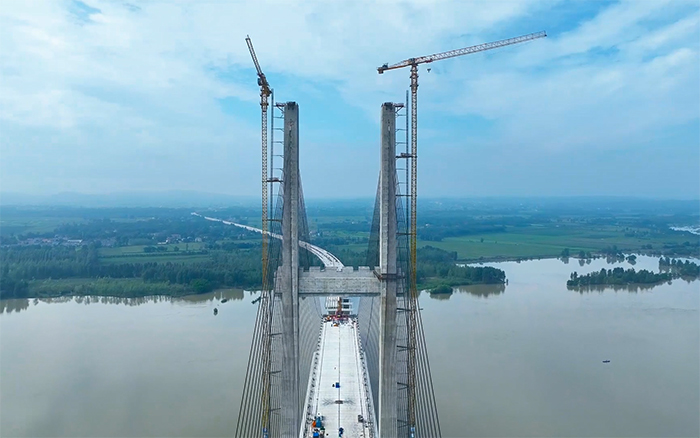 大橋主塔采用“H”型造型結(jié)構(gòu),總高度201米,XGT360-20S1、XGT7528A-18S1屹立在大橋兩側(cè)肩負(fù)主要吊裝工作,滿勤作業(yè)、高效運(yùn)轉(zhuǎn),保障高空對(duì)接安全,雙塔協(xié)力頻頻突破重要建設(shè)節(jié)點(diǎn)。
