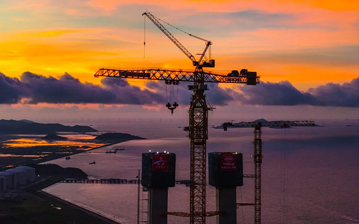 在封頂作業(yè)中,徐工塔機(jī)將百噸構(gòu)件以毫米級(jí)精度吊裝至200余米高空,硬剛10級(jí)海風(fēng),創(chuàng)造了海上橋梁建設(shè)新紀(jì)錄。多臺(tái)群塔協(xié)同作業(yè),創(chuàng)造性攻克"高空精度、抗風(fēng)穩(wěn)性、吊裝效率"三大世界級(jí)施工難題,展現(xiàn)了中國裝備的卓越性能。