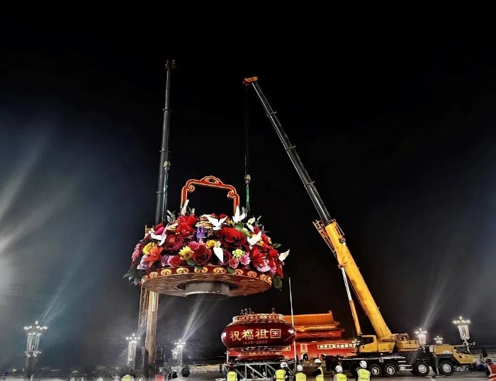 這已是徐工連續(xù)第十五年參與天安門國慶花籃吊裝任務(wù)。9月22日凌晨,兩臺(tái)徐工200噸級汽車起重機(jī)協(xié)同作業(yè),將重達(dá)60噸的籃盤平穩(wěn)起吊,與16米高的籃體實(shí)現(xiàn)毫米級精準(zhǔn)對接。